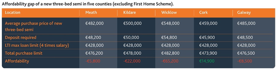 “While a new 3-bedroom semi-detached home is affordable in Cork and buyers with additional savings beyond the 10% loan-to-income limit should be able to overcome the gap in Meath and Galway, new 3-bedroom semi-detached homes in Wicklow and Kildare remain totally out of reach for people on these salaries. In addition, there are thousands of people on lower salaries who will not be able to buy and will require support.”