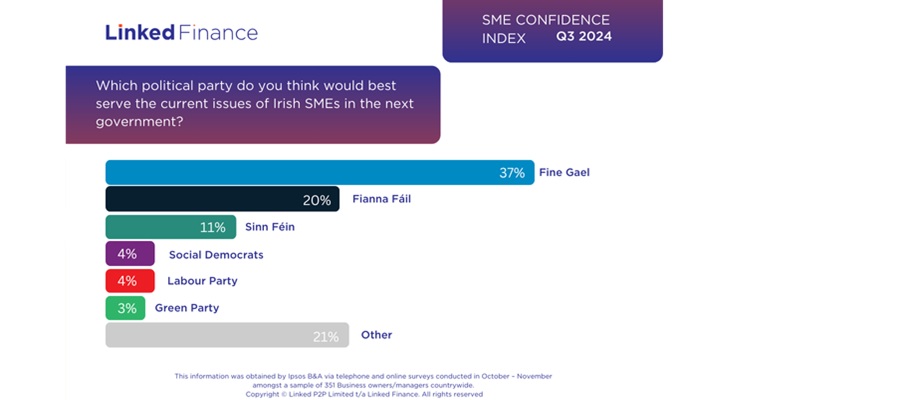 Fine Gael are the preferred party amongst SMEs - particularly in Dublin and have increased their lead (37%) over Fianna Fáil by points in Q2 to 17 points in Q3. The latter received 20% as the party of preference, while Sinn Féin are ranked best for business by 11% of respondents . However, 21% opted for “others” outside of the six main political parties.